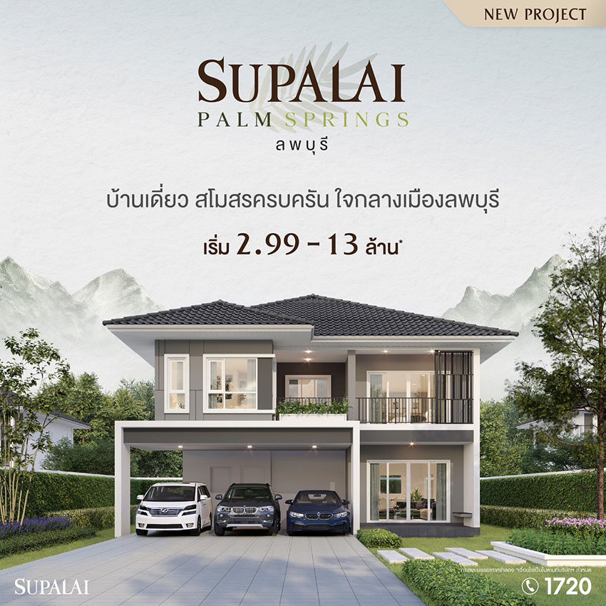 ศุภาลัย ปาล์มสปริงส์ ลพบุรี บ้านเดี่ยวหรู มูลค่าโครงการ 1,950 ล้านบาทบนพื้นที่โครงการกว่า 93 ไร่ จำนวน 390 ยูนิต ออกแบบภายใต้แนวคิด Tropical Modern ที่โดดเด่นทั้งด้านดีไซน์และฟังก์ชัน ให้ความรู้สึกโปร่ง โล่ง สบาย ผ่อนคลาย และใกล้ชิดธรรมชาติ สัมผัสวิวภูเขา บนทำเลศักยภาพตัวเมืองลพบุรี ที่มีให้เลือกสรรได้ตรงตามไลฟ์สไตล์ถึง 9 แบบ บนพื้นที่ใช้สอยตั้งแต่ 122-330 ตารางเมตร ในราคาเริ่มต้นเพียง 2.99-13 ล้านบาท* รองรับความต้องการของครอบครัวทุกขนาด เติมเต็มคุณภาพชีวิตด้วยสิ่งอำนวยความสะดวกครบครัน อาทิ คลับเฮาส์ ฟิตเนส สระว่ายน้ำ และสวนส่วนกลางที่เป็นพื้นที่สีเขียวขนาดใหญ่ ที่ออกแบบเพื่อรองรับการพักผ่อนและกิจกรรมของทุกคนในครอบครัว ตอบรับไลฟ์สไตล์ยุคดิจิทัลด้วยนวัตกรรม Smart Home Automation ที่ติดตั้งในบ้านทุกหลัง เพิ่มความสะดวกในการควบคุมอุปกรณ์ภายในบ้าน พร้อมยกระดับความปลอดภัยให้มั่นใจยิ่งขึ้น ด้วยระบบรักษาความปลอดภัยมาตรฐานสูง และกล้องวงจรปิด CCTV ตลอด 24 ชั่วโมงทั่วทั้งโครงการ