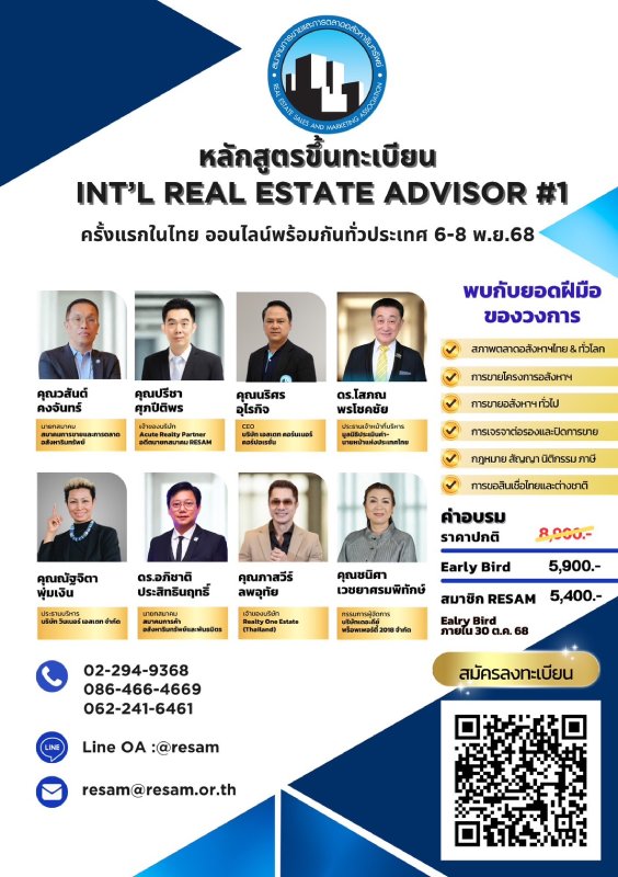 ทั้งนี้ผู้สมัครอบรมเพื่อขึ้นทะเบียน ราคาปกติ 8,900 บาท early bird 5,900/สมาชิก RESAM, สมาชิกพันธมิตร 5,400/สมัครในนามบริษัท 3 คนขึ้นไป 5,000 ภายใน 31 ตุลาคม 2568 นี้ สนใจลงทะเบียน คลิกที่นี้ https://forms.gle/ZXk81j6NoWehid7V8 หรือโทร. 02-2949368-9, 086-466-4669 Line: resam9836 อีเมล์: resam@resam.or.th