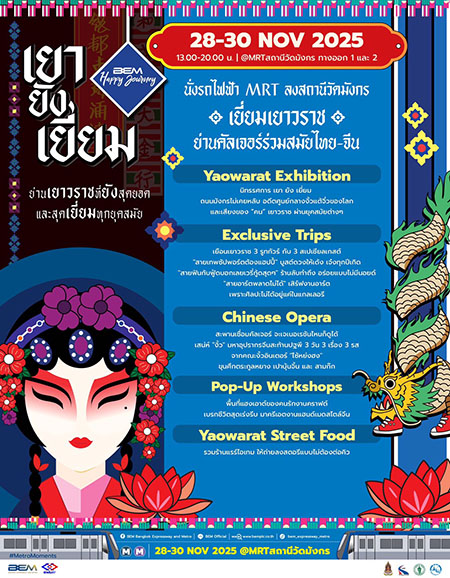 อย่าพลาดกับ BEM Happy Journey 2025 “เยา ยัง เยี่ยม” ตั้งแต่ 28-30 พฤศจิกายน 2568 เวลา 13.00 – 20.00 น. ณ สถานีวัดมังกร ทางออก 1 และ 2 เดินทางง่าย สะดวก สบาย ด้วยรถไฟฟ้า MRT หรือทางรถยนต์ด้วยทางพิเศษศรีรัช ทางลงพระราม 4 ชิดขวามุ่งหน้าหัวลำโพง ตรงเข้าสู่เยาวราช แล้วมาร่วมสัมผัสโมเมนต์ดีๆ ร่วมกับชุมชนเยาวราชไปด้วยกัน ติดตามรายละเอียดได้ทาง Facebook (เฟซบุ๊ก) : BEM Bangkok Expressway and Metro