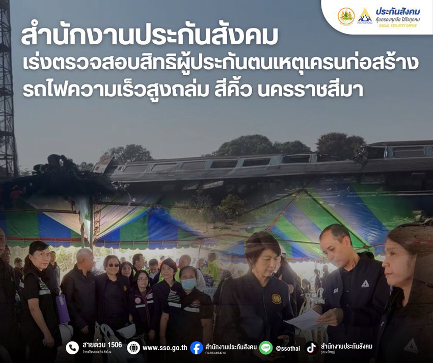 ตามที่เมื่อวันที่ 14 มกราคม 2569 เกิดเหตุเครนถล่มของโครงการก่อสร้างรถไฟความเร็วสูงถล่มทับขบวนรถไฟ บริเวณอำเภอสีคิ้ว จังหวัดนครราชสีมา นางสาวกาญจนา พูลแก้ว เลขาธิการสำนักงานประกันสังคม (สปส.) แสดงความห่วงใย พร้อมสั่งการให้สำนักงานประกันสังคมจังหวัดนครราชสีมา ตรวจสอบข้อมูลเพื่อเร่งให้การช่วยเหลือผู้ประสบเหตุดังกล่าวอย่างเร่งด่วนแล้ว