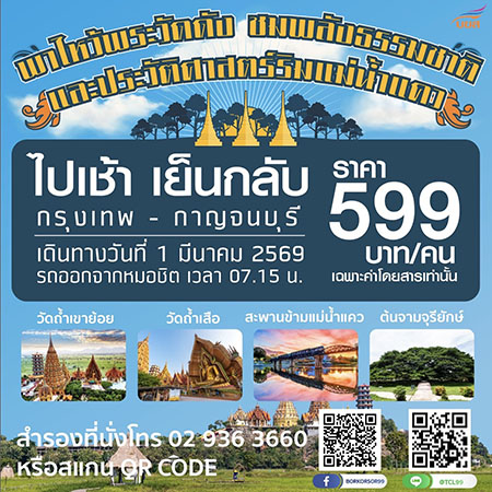 1.กิจกรรมไหว้พระวัดดัง ชมพลังธรรมชาติ และไม่พลาดชมประวัติศาสตร์ริมแม่น้ำแคว ณ จังหวัดกาญจนบุรี เดินทางวันอาทิตย์ที่ 1 มีนาคม 2569 อัตราค่าโดยสาร (ไป – กลับ) ราคา 599 บาทต่อคน โดยรถจะออกจากสถานีขนส่งผู้โดยสารกรุงเทพ (จตุจักร) หรือหมอชิต 2 เวลา 07.15 น. ซึ่งกิจกรรมนี้มีสถานที่ท่องเที่ยวน่าสนใจ เช่น นมัสการหลวงพ่อชินประทานพร “วัดถ้ำเสือ” ชมสัญลักษณ์ทางประวัติศาสตร์สมัยสงครามโลกครั้งที่ 2 “สะพานข้ามแม่น้ำแคว” และสัมผัสความยิ่งใหญ่ “ต้นจามจุรียักษ์” อายุกว่า 100 ปี